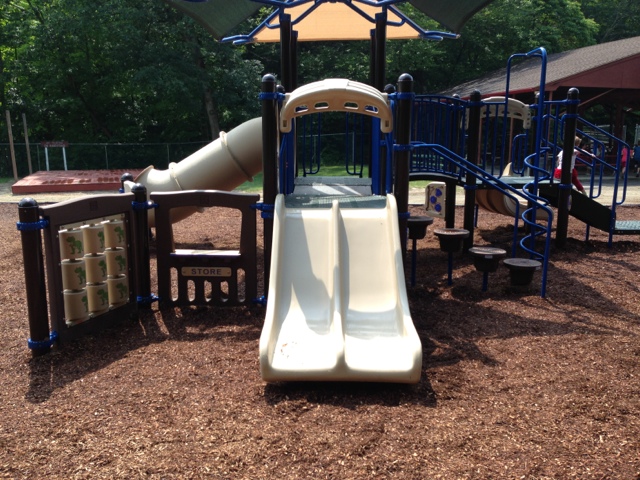 Finally our town playground is back open, months ago they closed it, ripped it out and we were told it would be open in April...well that never happened. Jack's party was planned for there, it was still closed, so 2nd location was used (our house). Since then we have driven by weekly, mostly to see the machines and "Kevin the train" from Thomas, who is a yellow construction vehicle (excavator). The kids are obsessed.